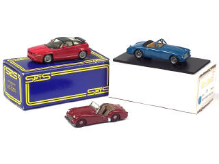 comprend : ALFA ROMEO ZAGATTO (essuie-glace à recoller), ASTON MARTIN DB2 cabriolet (manque essuie-glaces) & TRIUMPH TR3 (vitre de pare-brise incomplète) - on y retrouve les marques : HECO MODELES, SMTS & SPIELWAREN DANHAUSEN