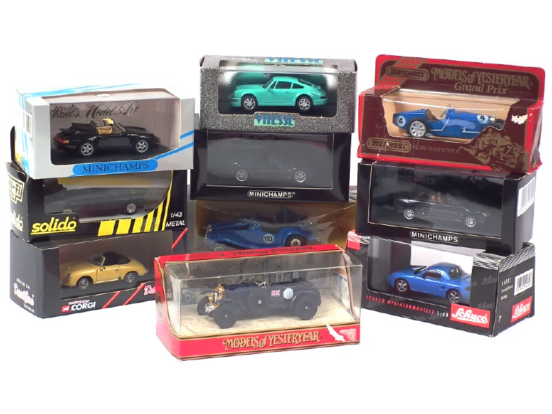 comprend : BENTLEY, BMW, BUGATTI, MG, MERCEDES, PEUGEOT & PORSCHE (4 exemplaires différents) - on y retrouve les marques : CORGI, DETAIL CARS, MINICHAMPS, MATCHBOX, SOLIDO, SCHUCO & VITESSE - 2 boîtes en états 'c'