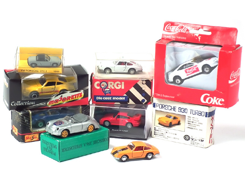 différentes échelles - comprend les modèles : 356, 911 (5 exemplaires différents), 930, 935 & 914-4 - on y retrouve notamment les marques : GORGI TOYS, CARARAMA, SCHUCO, MAISTO, MAJORETTE, MASUDAYA & IKEDA - on y joint une TOYOTA CELICA 'COCA COLA' - une boîte en état 'd'