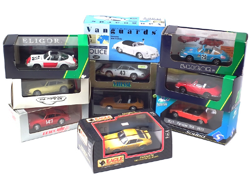 comprend les modèles : 356, 911 (8 exemplaires différents)& 914 - on y retrouve les marques : VANGUARD (série limitée numérotée 2157/2800 exemplaires), VITESSE, UNIVERSAL HOBBIES, MINICHAMPS (série limitée à 2016 exemplaires), SOLIDO & ELIGOR (dont 2 boîtes en états 'c')