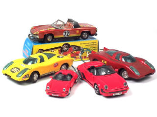 différentes échelles - états de 'A' à 'D' - comprend : 911 (2 exemplaires), 914 (boîte en état 'c' - moteur àpile non testé) & 917 (2 exemplaires à télécommande) - avec manques - on y retrouve notamment la marque : MAISTO