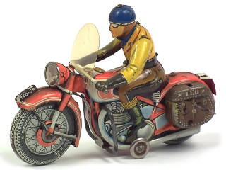 longueur 18 cm - avec moteur à ressort (fonctionne) & direction - pare-brise non d'origine - une petite restauration sur une roulette de maintien - guidon légèrement retouché