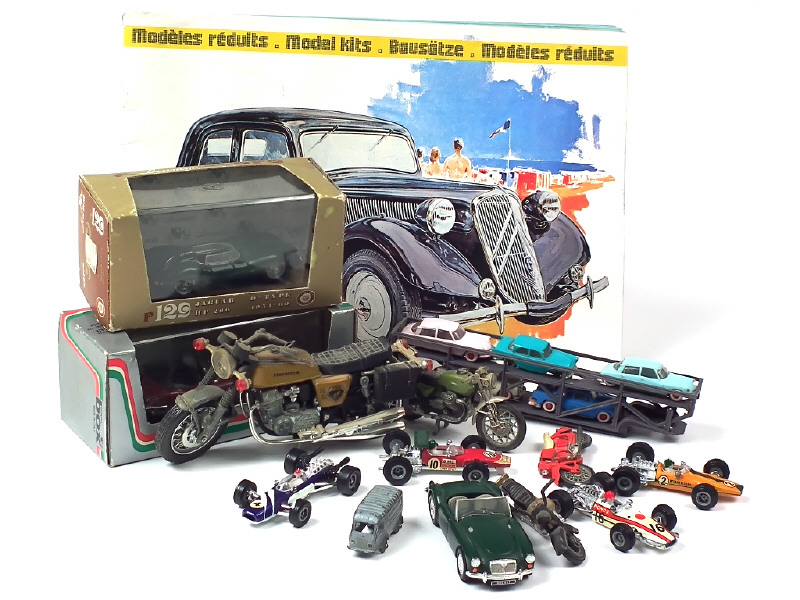 états de 'A' à 'R' - différentes échelles - comprend notamment les modéles : JAGUAR, MGA, MAC LAREN, LOTUS & CITROEN 19 - on y retrouve notamment les marques : CORGI TOYS, MAJORETTE, NOREV ' LES MICROMINIATURES', C.I.J & BRUMM - on y joint 4 motos & un catalogue 'HELLER' présentant différents modèles de la marque - quelques manques & parties cassées