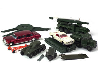 états de 'C' à 'E' - comprend notamment : camion porte-fusée (incomplète), MERCEDES-BENZ 600, FORD MUSTANG & PANHARD FL10 - on y retrouve notamment les marques : DINKY TOYS (GB) & SOLIDO - on y joint : élément de canon, éléments pour poseur de pont & une clef - avec manques & parties cassées