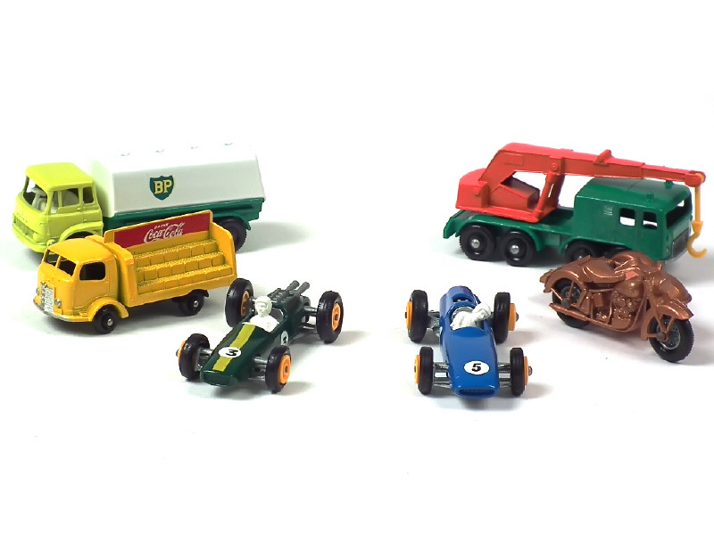 états de 'A' à 'B' - comprend les modèles : PETROL TANKER 'BP', WHEEL CRANE, CARRIER BANTAM 2T 'COCA-COLA', side-car HARLEY DAVIDSON, LOTUS & BRM (pilote & volant à repositionner)