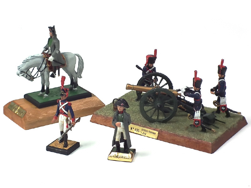 réalisation contemporaine en plomb - comprend 2 Napoléon 1er dont un à cheval sur socle bois, un militaire sur socle bois, 3 grenadiers avec pièce d'artillerie en situation sur socle bois.