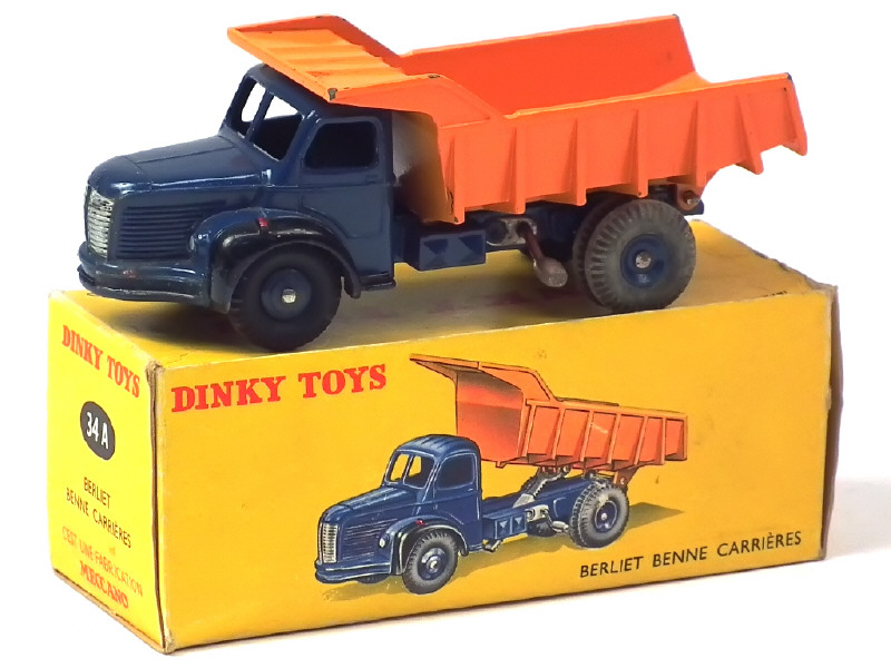 DINKY TOYS (FRANCE) 34A BERLIET Benne carrière MARREL (version avec jantes convexes) bleu foncé & orange