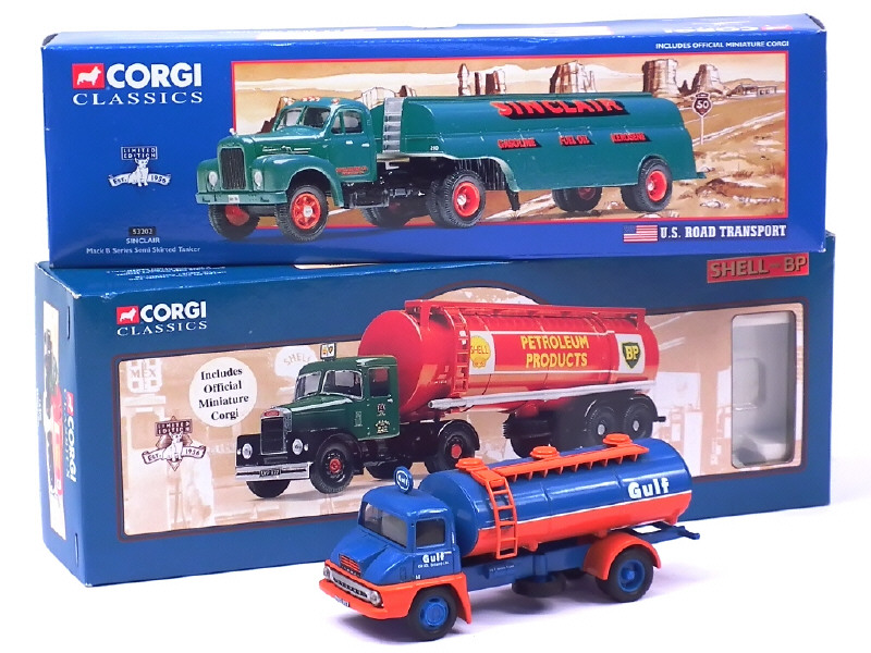 comprend : THAMES TRADER citerne 'GULF', MACK B semi-remorque citerne 'SINCLAIR' & SCAMMELL HIGHWAYMAN semi-remorque 'SHELL/BP' (manque pompe à essence & rétroviseurs)