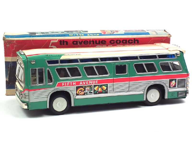 ASAHI TOY COMPANY (JAPON) 1295 GM Autocar 'FIFTH AVENUE' en tôle lithographiée vert, crème & argent