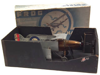 envergure : 46 cm - réalisation en papier, aluminium & bois du début du XXème siècle - très légères déformations & accrocs par endroits - importantes traces de vernis sur l'avant du modèle - avec système intégré à la boîte permettant le remontage de l'hélice (système à élastique) - avec manivelle & fiole de lubrifiant - boîte tachée avec quelques parties restaurées - BELLE REALISATION !