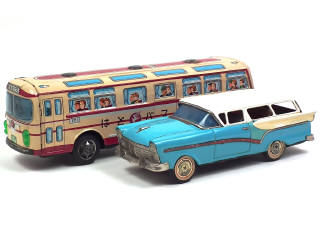ICHIKO (JAPON) 3 Autocar en tôle lithographiée saumon & bordeaux