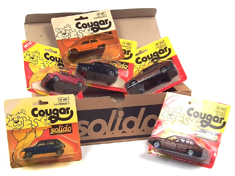 série 'COUGAR' - sous blisters jamais ouverts regroupés en coffret (référence 1314 VOLKSWAGEN GOLF) - comprend les modèles : PEUGEOT 504 (2 exemplaires), TALBOT TAGORA (3 exemplaires dont un avec blister déchiré), RENAULT 5 (2 exemplaires - boîtes décolorées avec un blister déchiré), PEUGEOT 104 (2 exemplaires), VOLKSWAGEN GOLF & CITROEN 2CV