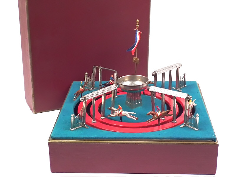 fonctionne - dimensions : 38 x 38 cm - avec drapeau sur son mât - un portique incomplet - quelques parties cassées & restaurées - manques de pellicule chromées à l'intérieur de la coupe centrale - quelques éclats majeurs sur les chevaux