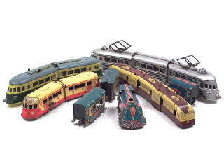 états de 'C' à 'E' - comprend 2 modèles avec moteurs à clef (fonctionnent) & 2 électriques (non testés) - quelques parties restaurées, manquantes & cassées - on y retrouve les marques JEP & JOUSTRA - on y joint une locomotive à vapeur 'ECLAIR' en tôle lithographiée avec tendeur, un wagon-voyageurs & bagages de la marque C.R (en état 'E)