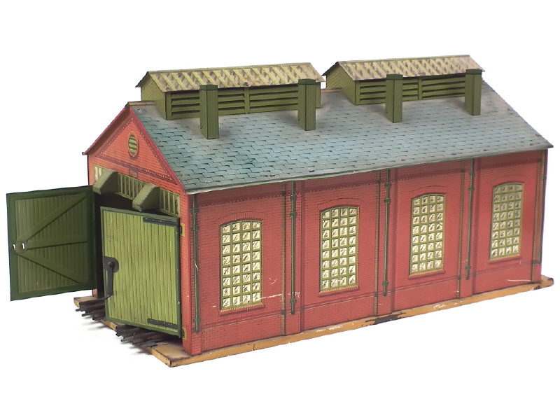 HORNBY 'O' (GB) Grand dépôt à double voies en tôle lithographiée vert, brique & gris bleu