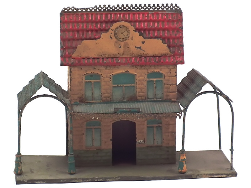 DIVERS Petite gare en tôle peinte beige rosé, vert & rouge