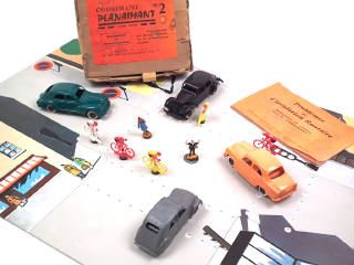 les véhicules sont de la marque CLE - échelle : 1/32ème - contient : PEUGEOT 203, SIMCA 9 ARONDE, CITROEN TRACTION 11 CV & 2 CV & 7 figurines (dont 5 coureurs cyclistes) - tous les éléments sont munis d'un aimant permettant la reproduction des différents incidents de la circulation routière - avec circuit aimanté 'CODE DE LA ROUTE' (dimensions : 75 X 51 cm) & notice - quelques petites traces d'oxydation sur les parties métalliques