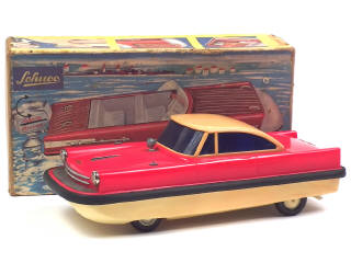 longueur 28 cm - moteur à piles (non testé) - avec notice - système de marche/arrêt & compartiment à piles oxydés - fêlures sur le toit & la lunette arrière - jantes plus ou moins fondues - parties nickelées plus ou moins ternies - quelques manques