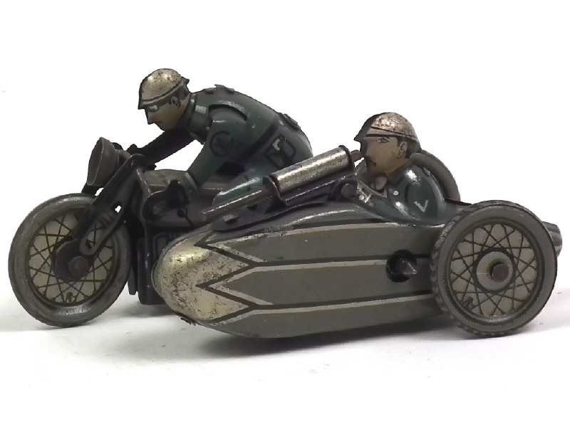 longueur 10 cm - moteur à clef (fonctionne) - mitrailleuse avec système de pierre à briquet (à revoir) - fourche de la moto légèrement tordue - traces d'oxydation par endroits