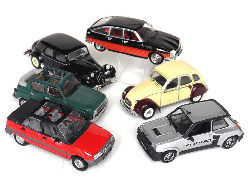miniatures reproduisant les modèles : RENAULT 4 HEULIEZ découvrable, RENAULT 5 Turbo, CITROËN 11CV large, CITROËN 2CV DOLLY, CITROËN VISA découvrable & CITROËN GS BASALTE
