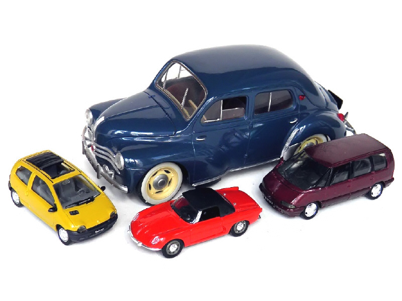 miniatures reproduisant les modèles : RENAULT ESPACE, RENAULT TWINGO, RENAULT 4CV (échelle 1/18ème, manque un feu arrière) & ALPINE RENAULT cabriolet (VEREM, manque un essuie-glace)