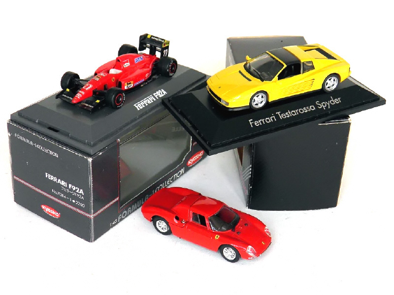 états de 'A' à 'B' - miniatures reproduisant les modèles : 275LM (carrosserie encrassée), F92A (carrosserie tachée, avec boîte état 'b') & TESTAROSSA Spyder (avec boîte état 'c') - on y retrouve les marques : BOX, KYOSHO & HERPA