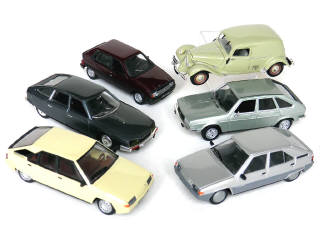 miniatures reproduisant les modèles : CITROEN 11BL fourgonnette danoise, CITROEN BX 16TRS, CITROEN BX LEADER, CITROEN CX 2200, CITROEN VISA & RENAULT 20