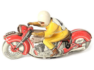 longueur 12,5 cm - moteur à clef (fonctionne) - sans clef - en action, la moto fait des cercles puis s'arrête & tourne sur elle-même avant de repartir - quelques rayures sur le châssis