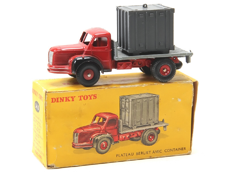 DINKY TOYS (FRANCE) 34B BERLIET Plateau avec container (version avec anneau moulé) rouge, plateau gris clair