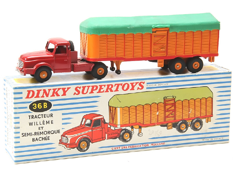 DINKY TOYS (FRANCE) 36B WILLEME Semi-remorque bâché (version avec jantes convexes) rouge & orange, bâche verte