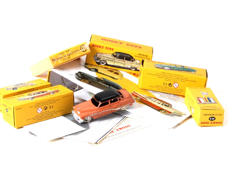rééditions des modèles dinky toys france : Buick Roadmaster, DS 19, Simca Chambord, Citroën 2cv, panneaux de route et poste de ravitaillement - on y joint les certificats, classeur, copie du catalogue 1954 et une petite plaque émaillée 2CV
