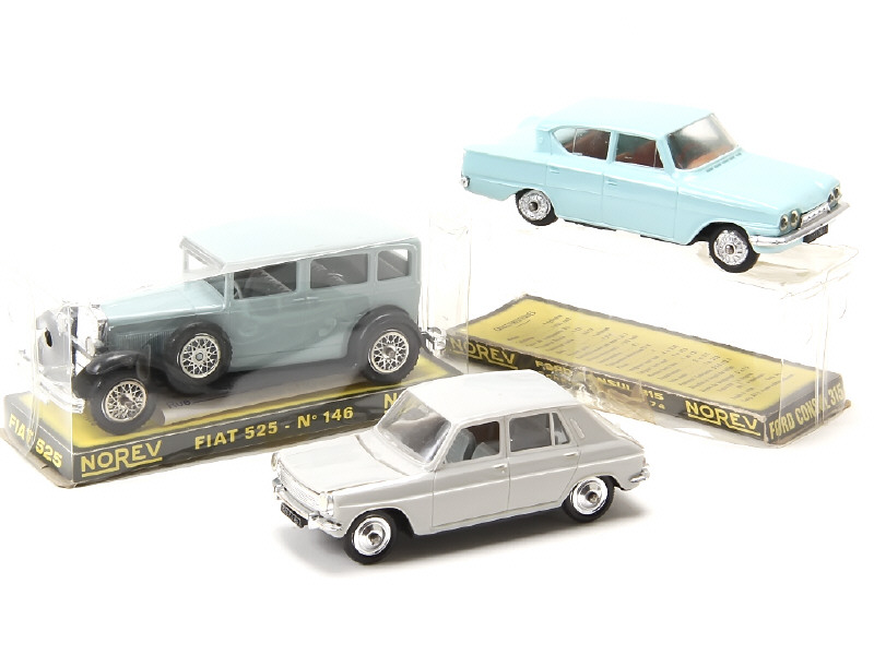 comprend les modèles : FORD CONSUL 315 (jantes fondues avec boîte en état 'c'), FIAT 525 (avec bulletin d'inscription au 'GRAND RALLYE NOREV' 1969) & SIMCA 1100