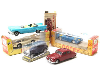 états de 'A' à 'B' - comprend les modèles : CHRYSLER NEW YORKER, JAGUAR 2.4L, PEUGEOT 201 (avec bulletin d'inscription au club), PORSCHE 917 (traces d'humidité sur la carrosserie) & CHEVRON B23 - quelques carrosseries légèrement déformées - les boîtes sont en états de 'b' à 'e'