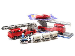 comprend les modèles : BERLIET GBK 18 grande échelle de pompiers (2 exemplaires différents dont un de fabrication récente avec blister de boîte plus ou moins déformé), JAGUAR TYPE E (série 'PLASTIGAM - KOVAP') & le petit train interlude (état 'B' avec petites taches sur l'ensemble du modèle) - on y joint une carte postale de la série télévisée 'LE PETIT TRAIN REBUS' (non présenté sur la photo) - 2 exemplaires sans boîte