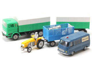 états de 'A' à 'B' - comprend les modèles : PEUGEOT J7 'POLICE', MERCEDES LP2223 plateau à ridelles avec remorque bâchés & RENAULT R86 avec remorque bétaillère - axes de roues plus ou moins oxydés
