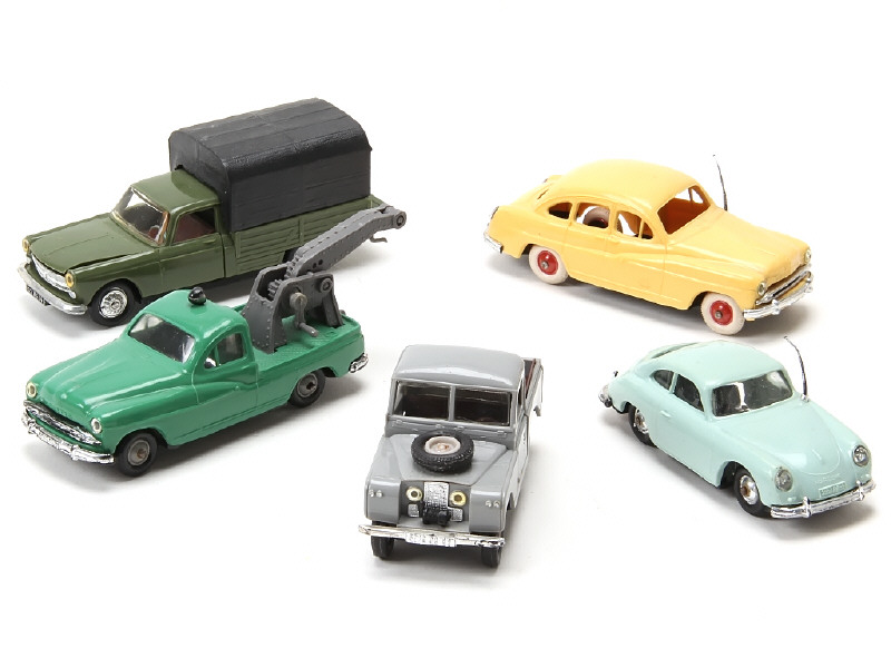 comprend les modèles : FORD VEDETTE 1954, dépanneuse, PEUGEOT 404 camionnette, LAND ROVER safari & PORSCHE CARRERA 1500 - jantes plus ou moins fondues - 2 carrosseries légèrement déformées - petits manques de pellicule chromée