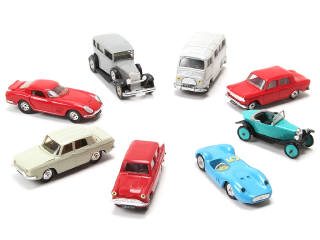 comprend les modèles : RENAULT ESTAFETTE, 10, FIAT 525, 1500, CITROËN 5HP, FERRARI 275, MASERATI SPORT & FORD ANGLIA (manque un rivet) - quelques carrosseries plus ou moins déformées - pellicules chromées légèrement altérées