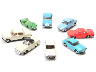 comprend les modèles : SIMCA 1500, RENAULT FLORIDE, 16, PLEIN CIEL, MASERATI, MERCEDES 220, FORD TAUNUS 17M & ALFA ROMEO GIULIETTA - quelques carrosseries plus ou moins déformées avec traces d'humidité par endroits - pellicules chromées légèrement altérées - jantes plus ou moins fondues