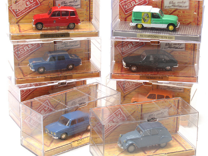 comprend les modèles : RENAULT 8 (2 exemplaires différents), 4 (3 exemplaires différents), 16, CITROËN ID break & 2CV AZLM