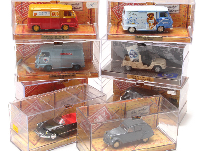 comprend les modèles : RENAULT ESTAFETTE (3 exemplaires différents), CITROËN MEHARI, ID break, 2CV fourgonnette (2 exemplaires différents) & DS cabriolet