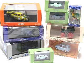 différentes échelles - comprend les modèles : RENAULT ESTAFETTE, CARAVELLE, PANHARD PL17, PEUGEOT 607, SIMCA ARONDE, 1000 rallye, FIAT 500 & DELAMARE - on y joint un coureur cycliste - un exemplaire sous sachet jamais ouvert