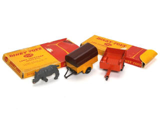 états de 'A' à 'C' - comprend : 2 remorques dont une avec quelques retouches d'usine, 2 lampadaires (en boîte état 'd' - référence 755 & 756) & un rhinocéros - on y retrouve les marques : CORGI TOYS & DINKY TOYS (FRANCE & GB)