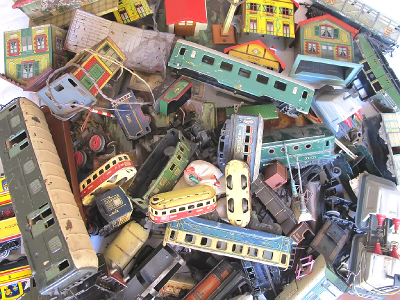 Etats divers - pour restauration ou pièces - bâtiments, gares, transformateur, autorail, parties de locomotives, wagons et voitures, accessoires - on y joint un fort lot de rails - manques, oxydation et accidents