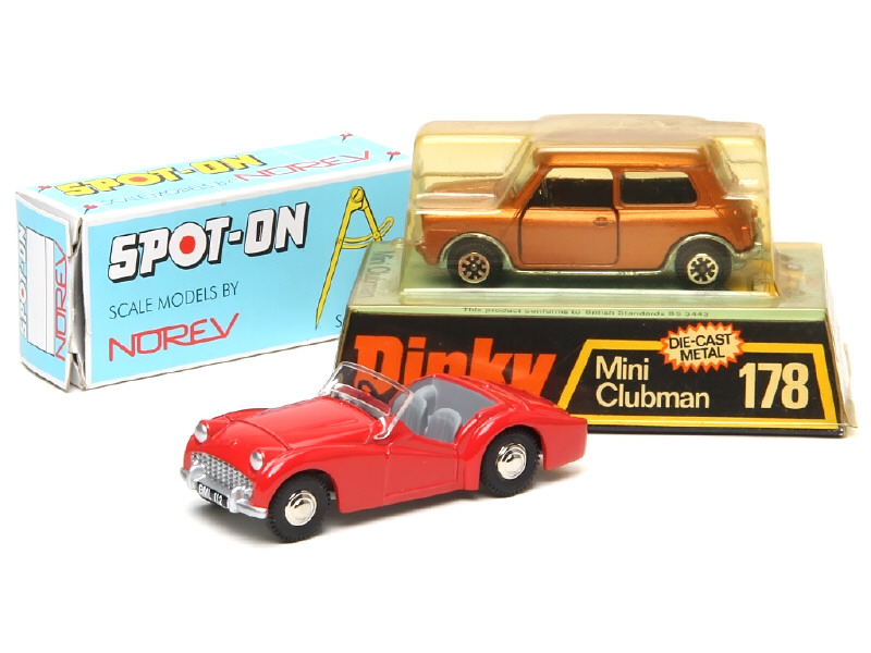 traces d'humidité sur le plancher - blister de boîte jauni - o ny joint une TRIUMPH TR3 (en état 'A+.b') de la marque NOREV/SPOT-ON (réedition)
