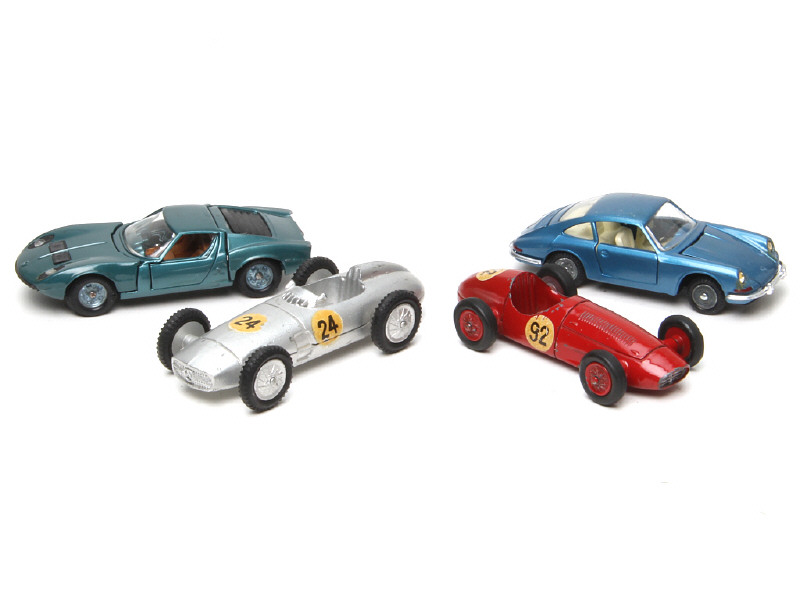 états de 'C' à 'D' - comprend : MERCEDES de courses, MASERATI de courses, LAMBORGHINI MIURA & PORSCHE 912 - on y retrouve les marques : MEBETOYS (petits manques sur un exemplaire) & MERCURY