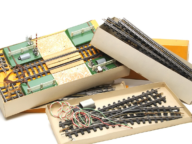 comprend : aiguillages électro-mécanique (2 exemplaires), rails électriques droits (boîte incomplète) & passage à niveaux électrique (une barrière cassée)