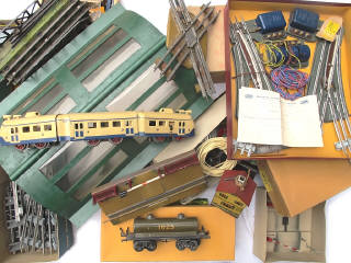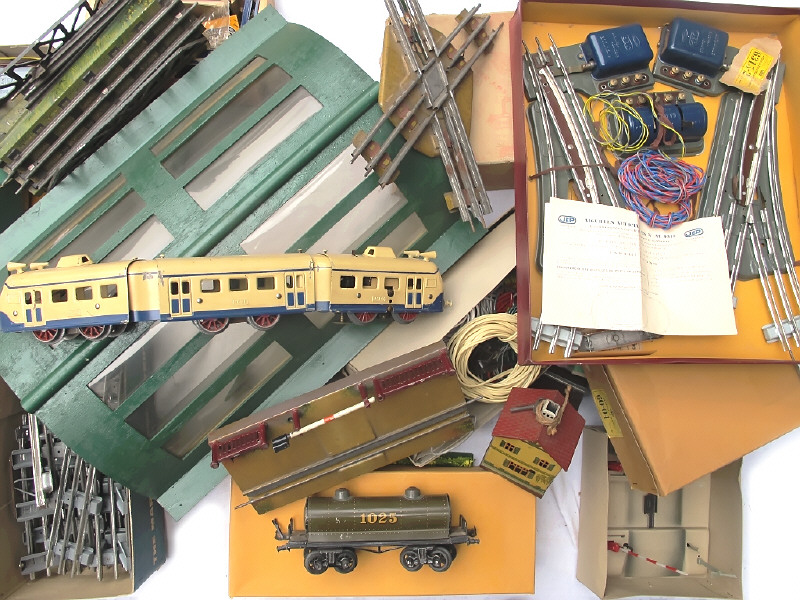 Bon état général - 1 grand hangar métro - un autorail triple - aiguillages, rails, poste d'aiguillage, passage à niveau, transformateur, pont suspendu, accessoires - quelques boites d'origine - on y retrouve principalement les marques JEP et Hornby - possibilité de petits manques er accidents