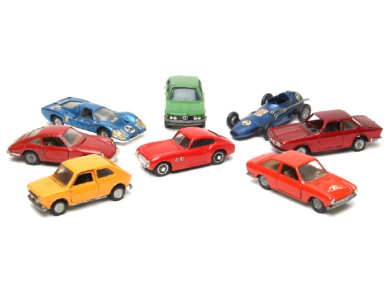 états de 'C' à 'D' - comprend : PORSCHE, FIAT (2 exemplaires différents), CISITALIA, VANWALL, BMW (2 exemplaires différents) & PANTHER (petits détails depeinture argentée ajoutés - on y retrouve les marques : DUGU, MERCURY, MEBETOYS & POLITOYS - avec manques & parties cassées