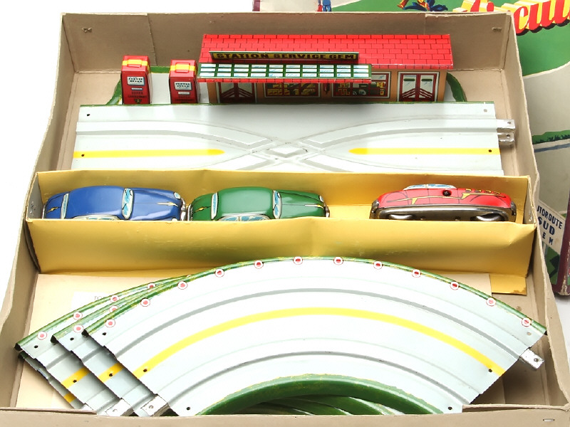 dimensions 38 x 38 cm - contient : station-service, 4 rails courbes, un rail droit & 3 voitures mécaniques (moteurs à clef fonctionnent - un plancher incomplet) - avec clefs & notice