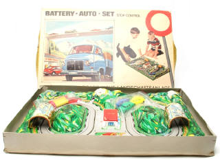 dimensions du circuit 53,5 x 34 cm - moteur à piles (non testé) - avec 6 véhicules (CITROEN DS 19, OPEL KAPITAN, FIAT 1800 (2 exemplaires), BMW 502, un camion-benne & 2 tunnels) - réalisation en plastique moulé - oxydation sur les parties métaliques du boitier à piles